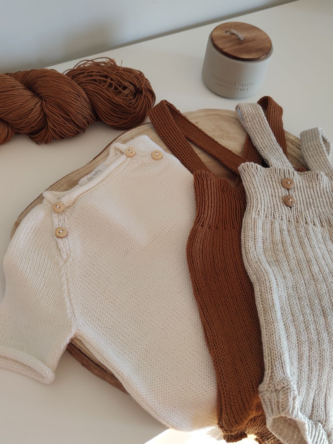 Três peças de roupa de bebé em malha sobre uma superfície clara com novelo de lã castanha e vela com tampa de madeira.