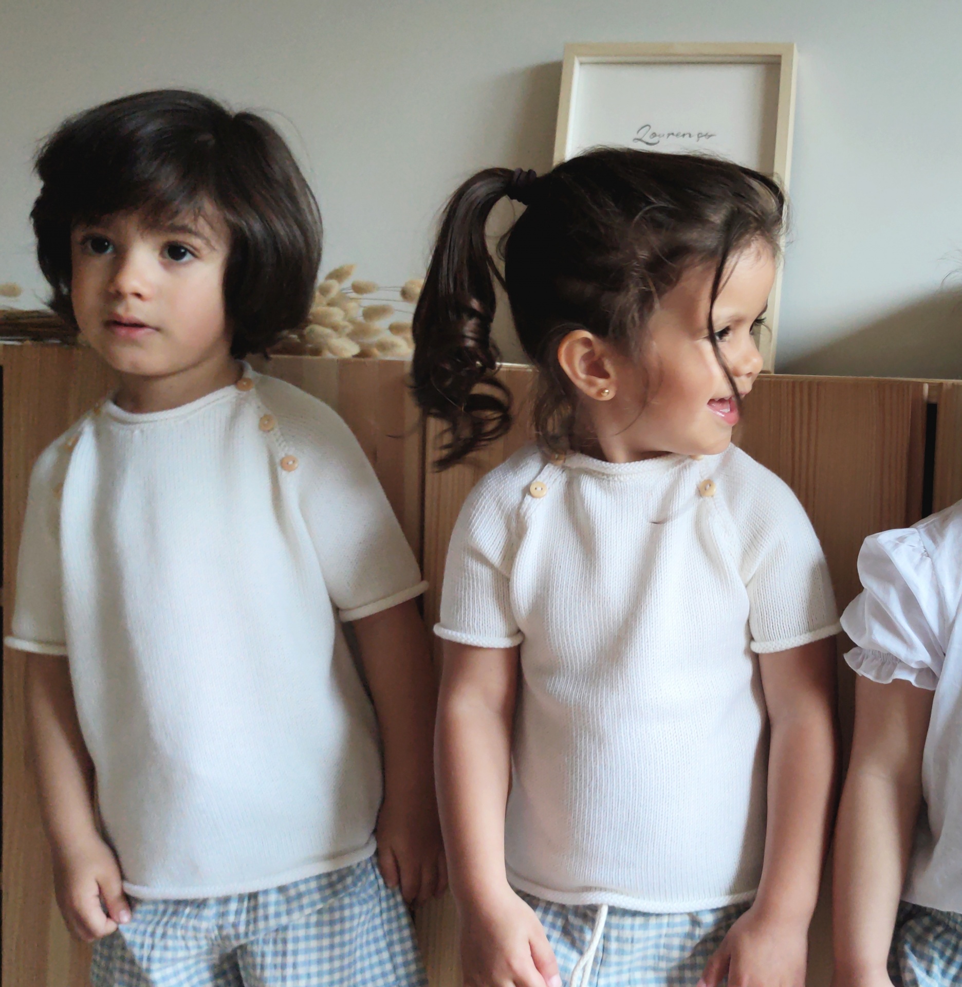 • Crianças com camisolas de malha branca e calças às riscas em ambiente interior