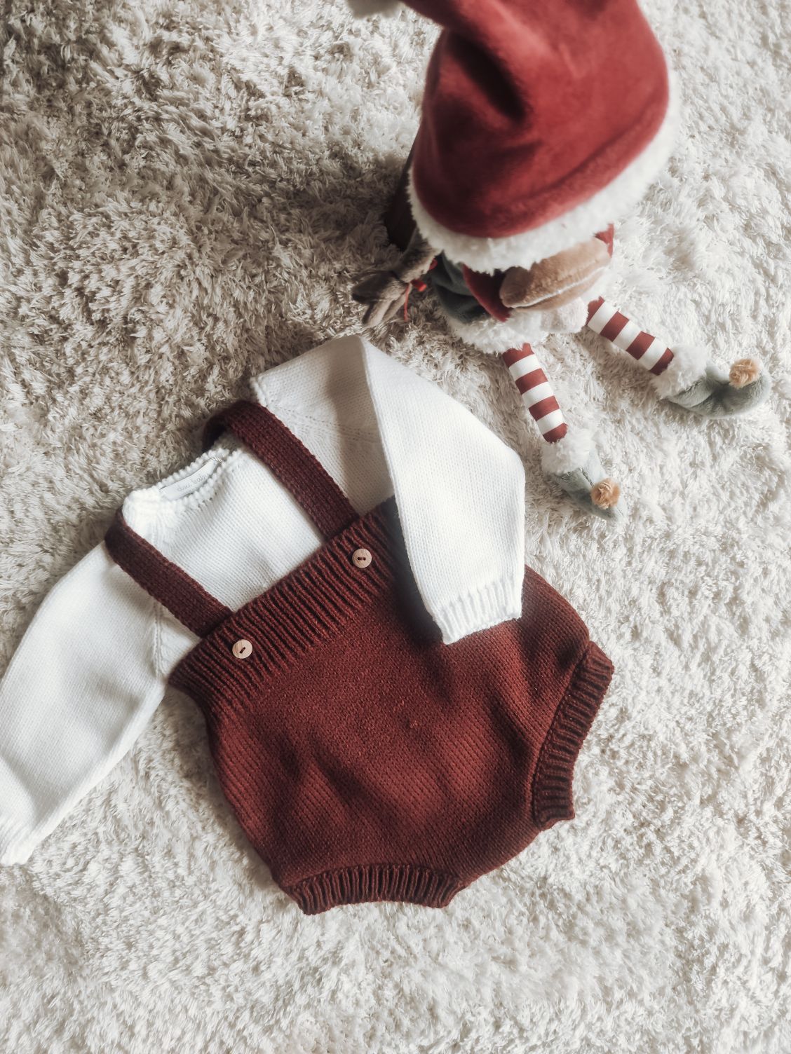 • Conjunto de bebê de malha com jardineiras castanho-avermelhadas e camisola branca sobre carpete, com boneco decorativo vermelho ao lado.