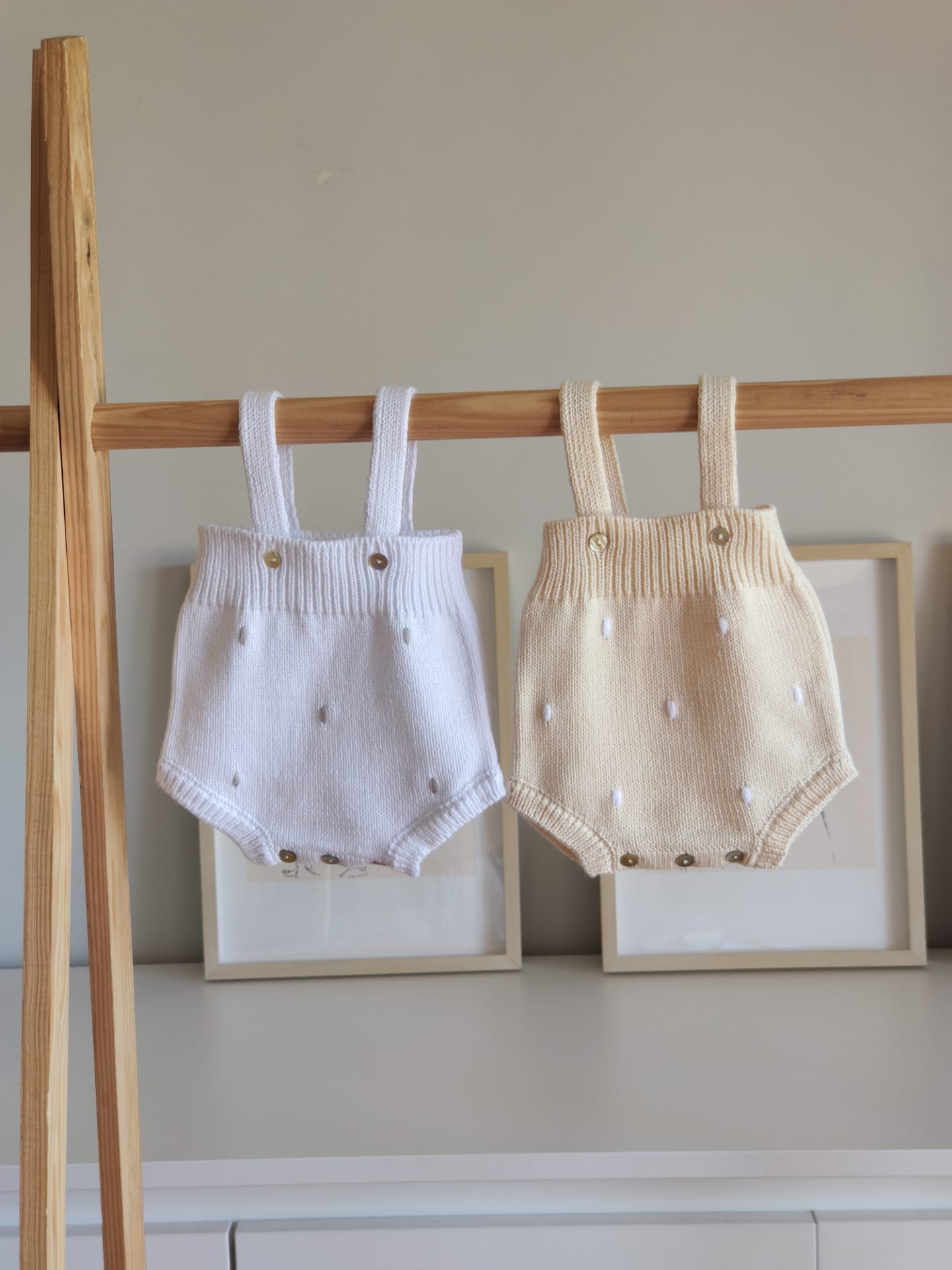 • Dois macacões de bebé em malha branco e bege pendurados num varão de madeira