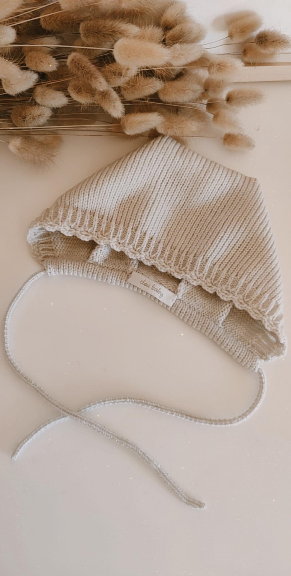 • Gorro de malha branca com cordões e textura canelada em fundo branco com decoração seca